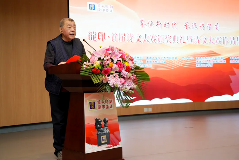 承德市郭小川研究會(huì)會(huì)長(zhǎng)步九江發(fā)表致辭,“鑒證新時(shí)代 承德詩(shī)酒香——龍印·首屆詩(shī)文大賽”這場(chǎng)活動(dòng)參與人員之多,高手云集之密,采訪挖掘之深,作品質(zhì)量之高,在承德文學(xué)史上尚屬首次。