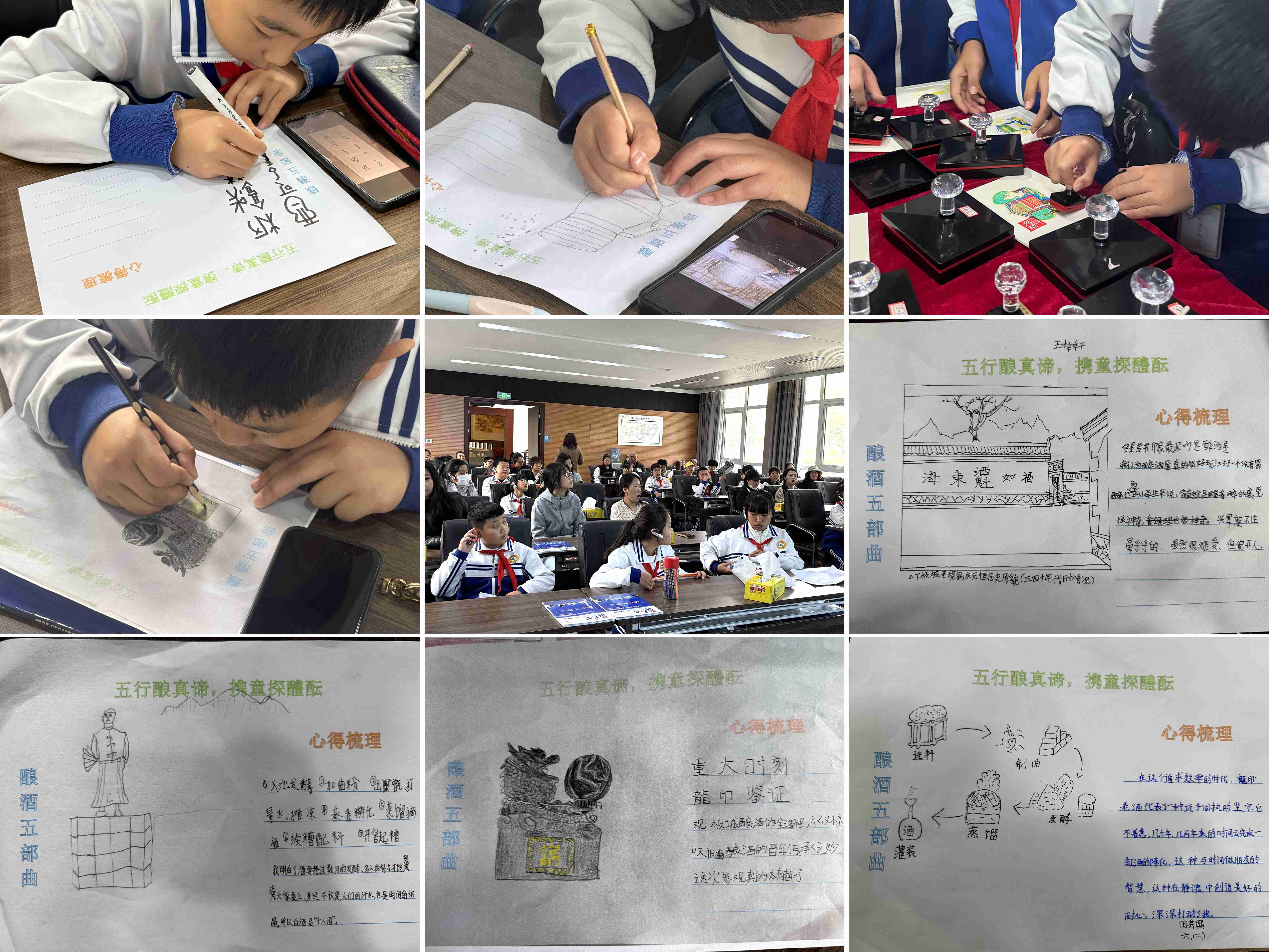 實踐創(chuàng)作環(huán)節(jié),孩子們伏案疾書,憑借細致的觀察,獨立繪制出從“原料篩選”到“灌裝”的完整釀酒流程圖,家長們則從旁協助,與孩子一同討論工藝細節(jié),梳理心得思路。