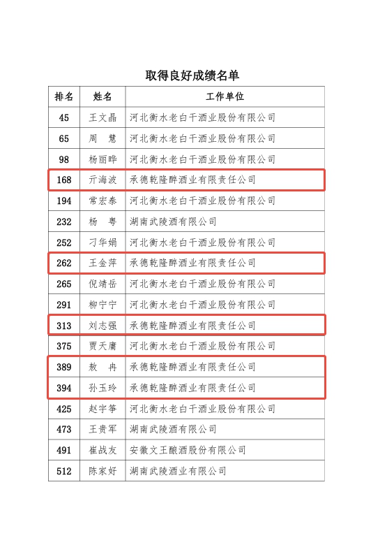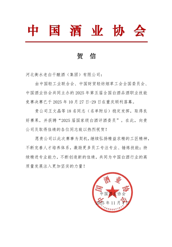在第五屆全國白酒品酒職業(yè)技能競賽中,衡水老白干及旗下四家子公司18位選手穩(wěn)定發(fā)揮,取得良好賽果,被聘任為“2025屆國家級白酒評酒委員”;其中板城酒業(yè)孫玉玲、劉志強、王金萍、敖冉、亓海波5位選手參加比賽,通過比賽斬獲優(yōu)異成績,均被聘任為“2025屆國家級白酒評酒委員”。板城酒業(yè)成為河北省除衡水老白干酒業(yè)外最多入選人數(shù)的酒企,其中,敖冉、亓海波兩名選手初次參賽獲聘國家級白酒評酒委員。